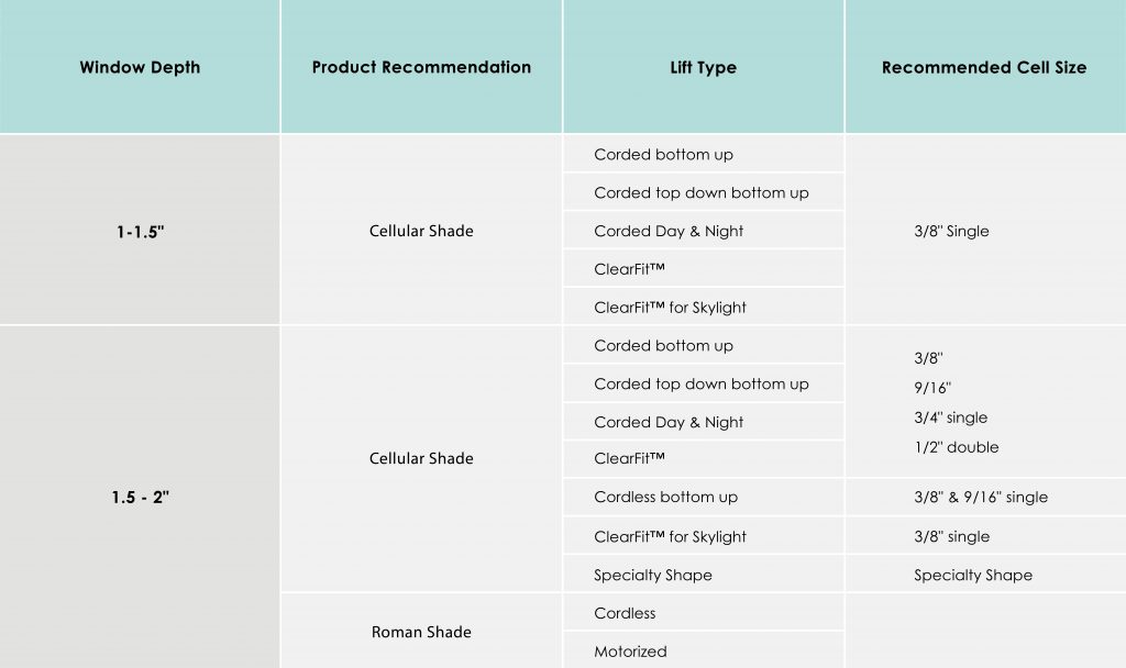 Shallower windows require some creativity – and measuring – to find the right treatment! For window depths of 1″ to 2″, see the recommendations below from our cellular and Roman collections. For window depths of less than 1″, mount any Veneta™ blind or shade on the outside of the window casing. Please see How To Measure for further details and more about outside vs. inside mounts.